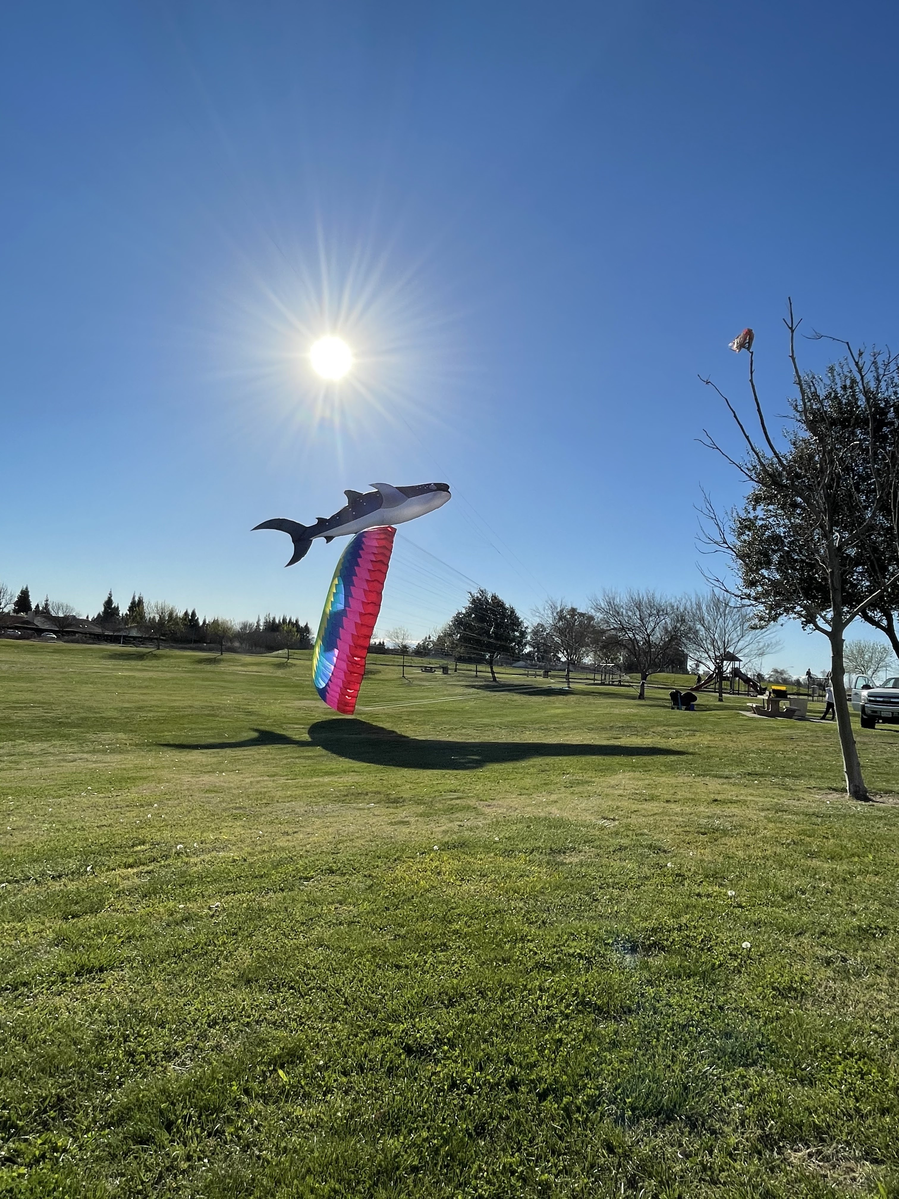 While out on my walk I saw these huge kites at the park so I ran home and got the kids. They were huge and really fun to watch.